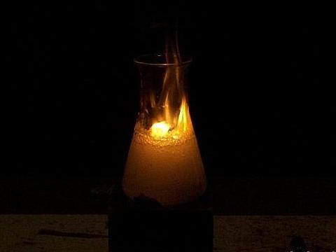 Po dodaniu kwasu natychmiast rozpoczyna się wytwarzanie gazu i tu spotyka nas ciekawa niespodzianka - gdy tylko pęcherzyk gazu wydostanie się na powierzchnię natychmiast z trzaskiem spala się jasnym płomieniem obserwujemy przy tym delikatny dym.
