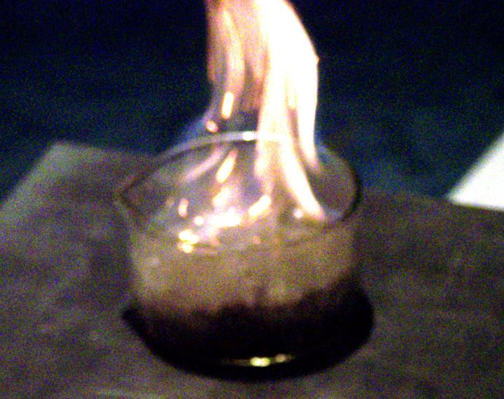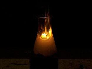 Mieszaninę możemy umieścić w probówce zamocowanej na statywie i ogrzewać aż do rozżarzenia zawartości, probówka w wielu miejscach popęka i jej dolna część zabarwi się na ciemnobrązowo. Po ostygnięciu z mieszaniny poreakcyjnej należy usunąć odłamki szkła i zebrać ją do innego naczynia - będzie potrzebna w dalszej części eksperymentu.