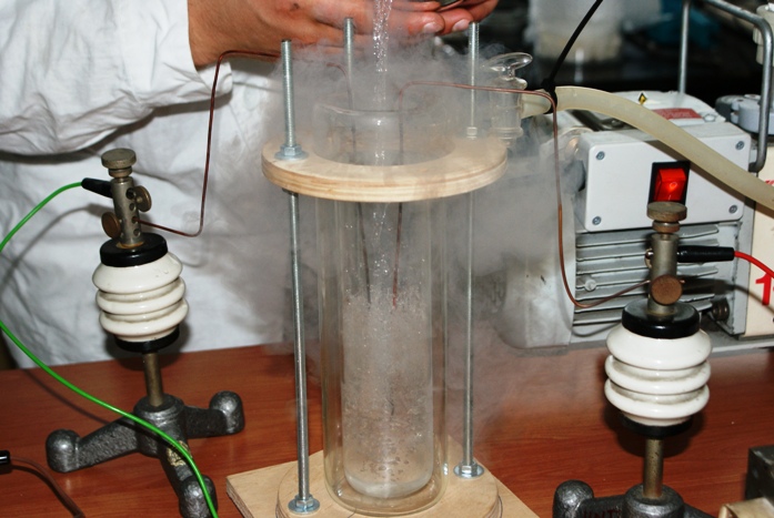 W otoczeniu ciekłego azotu nawet po zwiększeniu napięcia w stosunku do eksperymentu w powietrzu bardzo trudno zapalić jest wyładowanie. Koniecznością jest zwarcie elektrod.