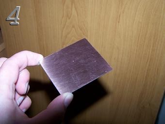 Zdjęcie trzecie - dociętą płytkę z laminatu musimy bardzo dokładnie umyć od strony miedzi, nie może na niej pozostać nawet ślad tłuszczu ani odrobinka tlenku. Płytka może być porysowana ale czysta tak jak na zdjęciu czwartym.