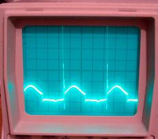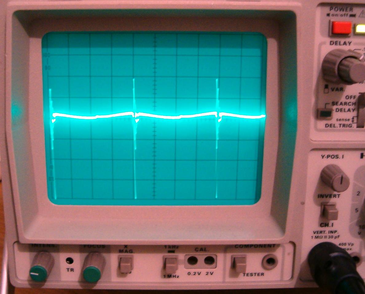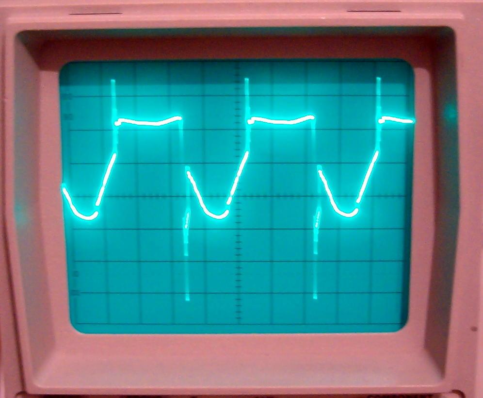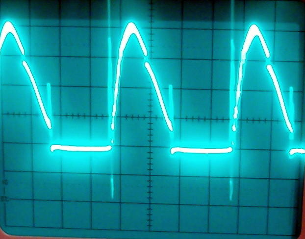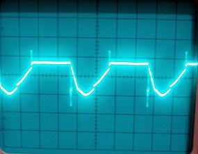 Gdy mamy do dyspozycji oscyloskop - możemy podjąć się nieco bardziej dokładnych pomiarów. Powyżej zdjęcia przebiegów na bazie, kolektorze i emiterze jednego z tranzystorów.