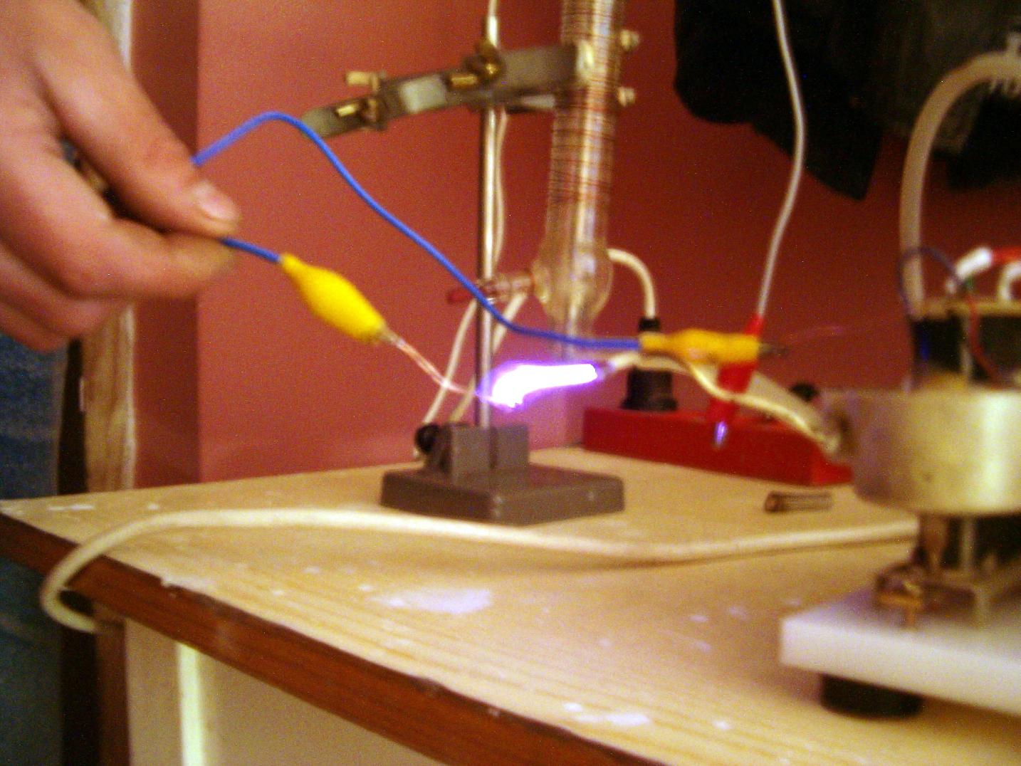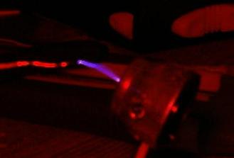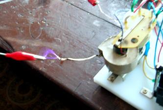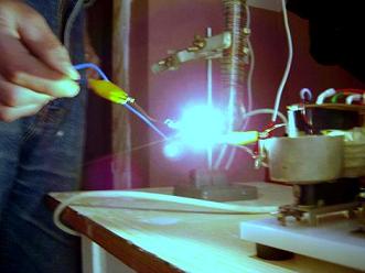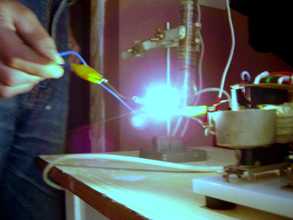 Wszystkie parametry elektryczne takie jak: moc, czestorliwość, maksymalne napięcie i prąd zasilania, prąd na wyjściu zbadamy na następnej stronie. A pod tekstem efekty wizualne. Niestety robione przezemnie zdjęcia nawet w połowie nie odzwierciedlają tego co można zobaczyć gołym okiem. Mój aparat nie ma aż tak dobrych parametrów by dobrze fotografować szybkozmienne wyładowania. Nie mniej cos tam zawsze widać. Najdłóższy łuk elektryczny jaki udało mi się zapalić na tym generatorze miał długość 3 cm.