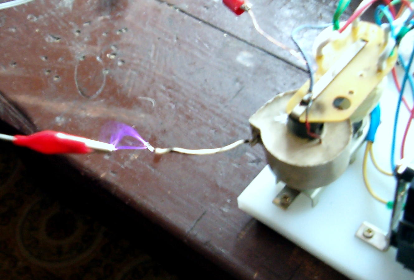 Prawidłowo wykonany generator działa od razu po podłączeniu do prądu, pracę generatora poznamy po charakterystycznym pisku transformatora pracującego na częstotliwości kilkudziesięciu kiloherców. I oczywiście po tym do czego został zbudowany - wysokim napięciu na uzwojeniu wtórnym. PAMIĘTAJ O ZWARCIU DO MASY JEDNEGO Z WYPROWADZEŃ ORYGINALNEJ TELEWIZYJNEJ CEWKI WYSOKONAPIĘCIOWEJ !!!.