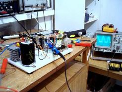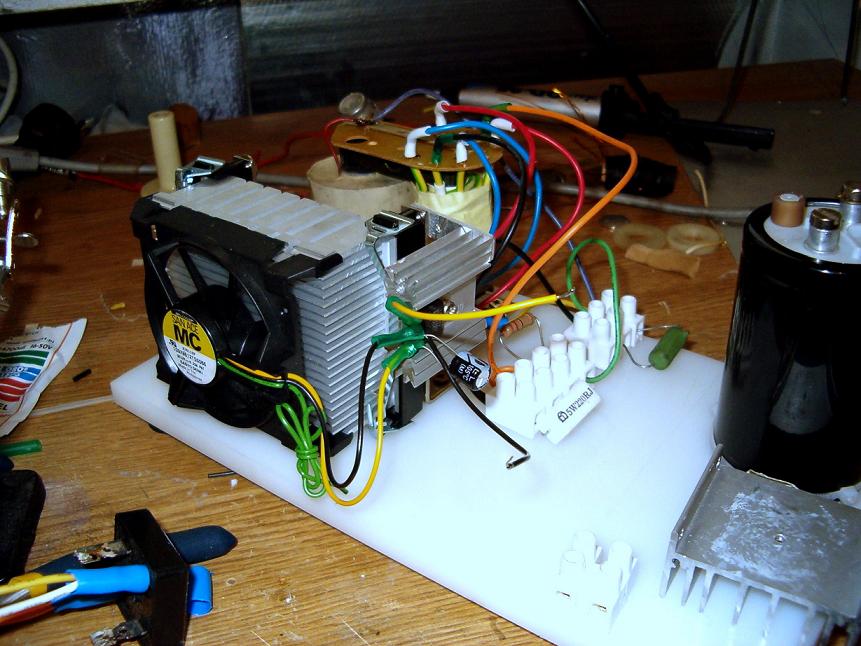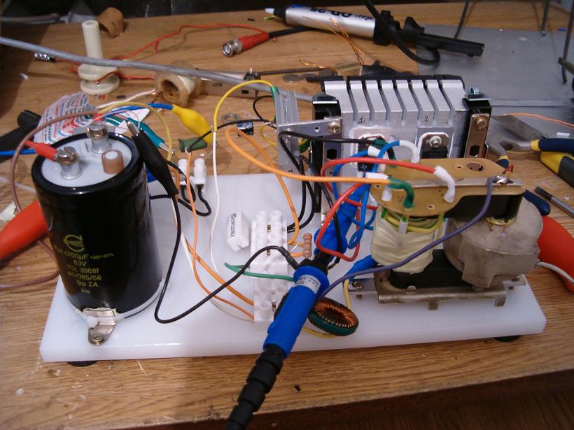 Po przetestowaniu i sprawdzeniu działania naszego układu możemy przystąpić do prac kosmetycznych. Montujemy nasz układ np. jak w moim przypadku na kawałku białego polietylenu z nózkami. Oprócz samego generatora zamontowałem też układ zasilania składający się z: mostka prostowniczego z radiatorem, kondensatora filtrującego oraz dławika o indukcyjności 20 µH, jak się później okazało dławik ten poprawił wydajność generatora o dobre 70 %.